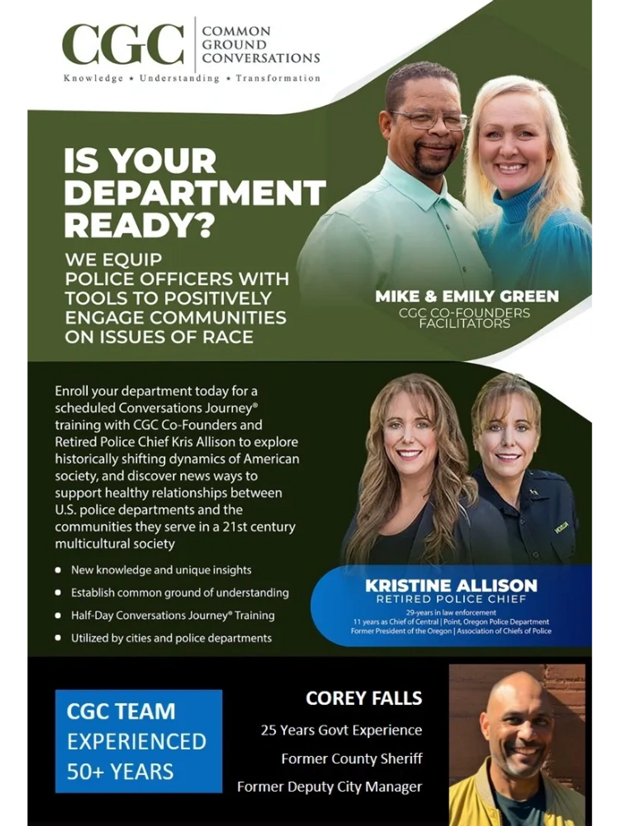 RESULTS: At the end of 2022, the CPPD Police Chief retired. In early 2023, she joined CGC as a consulting partner to continue the work we developed in the department together through her leadership. After experiencing a CGC Conversations Journey, a neighboring police chief joined with the CPPD chief in recommending CGC to Oregon's statewide training of all first responders for consideration and adoption. The state of Oregon has expressed considerable interest and is currently considering opportunities to incorporate our Conversations Journey process in its training schedule.